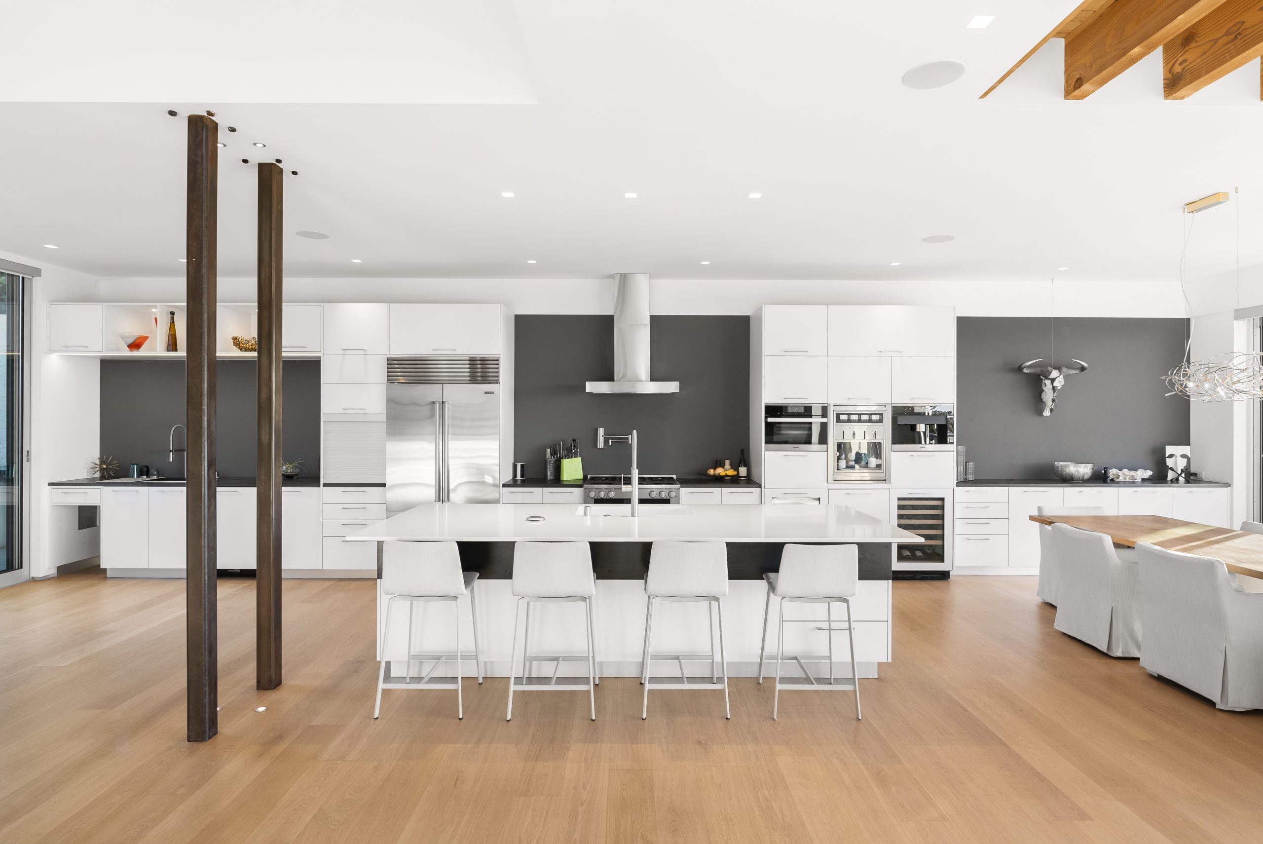 The chef’s kitchen is a true focal point, featuring Sub-Zero, Miele, and Bosch appliances, custom cabinetry, quartz countertops, a striking cantilevered island, dual dishwashers, and a built-in coffee station—designed for both elevated entertaining and everyday living. A separate wine center completes the gourmet experience.