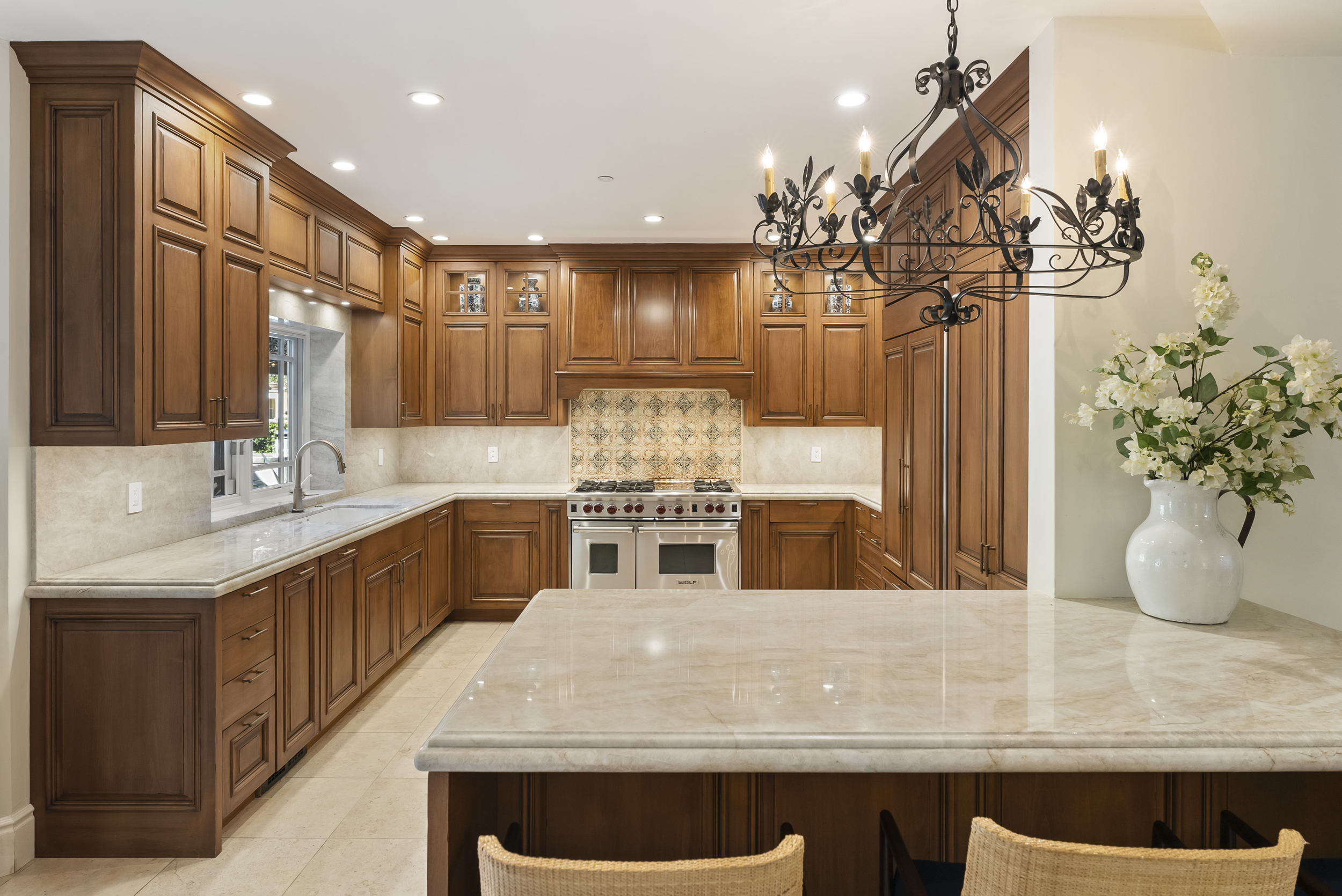 The heart of the home is a custom chef's kitchen appointed with stunning stone countertops, custom wood and stainless cabinetry, and state-of-the-art appliances — ideal for everyday cooking and upscale entertaining alike. The main level offers a graceful flow between the family room, handsome library, private office, and a guest bedroom, providing comfort and flexibility for residents and visitors.