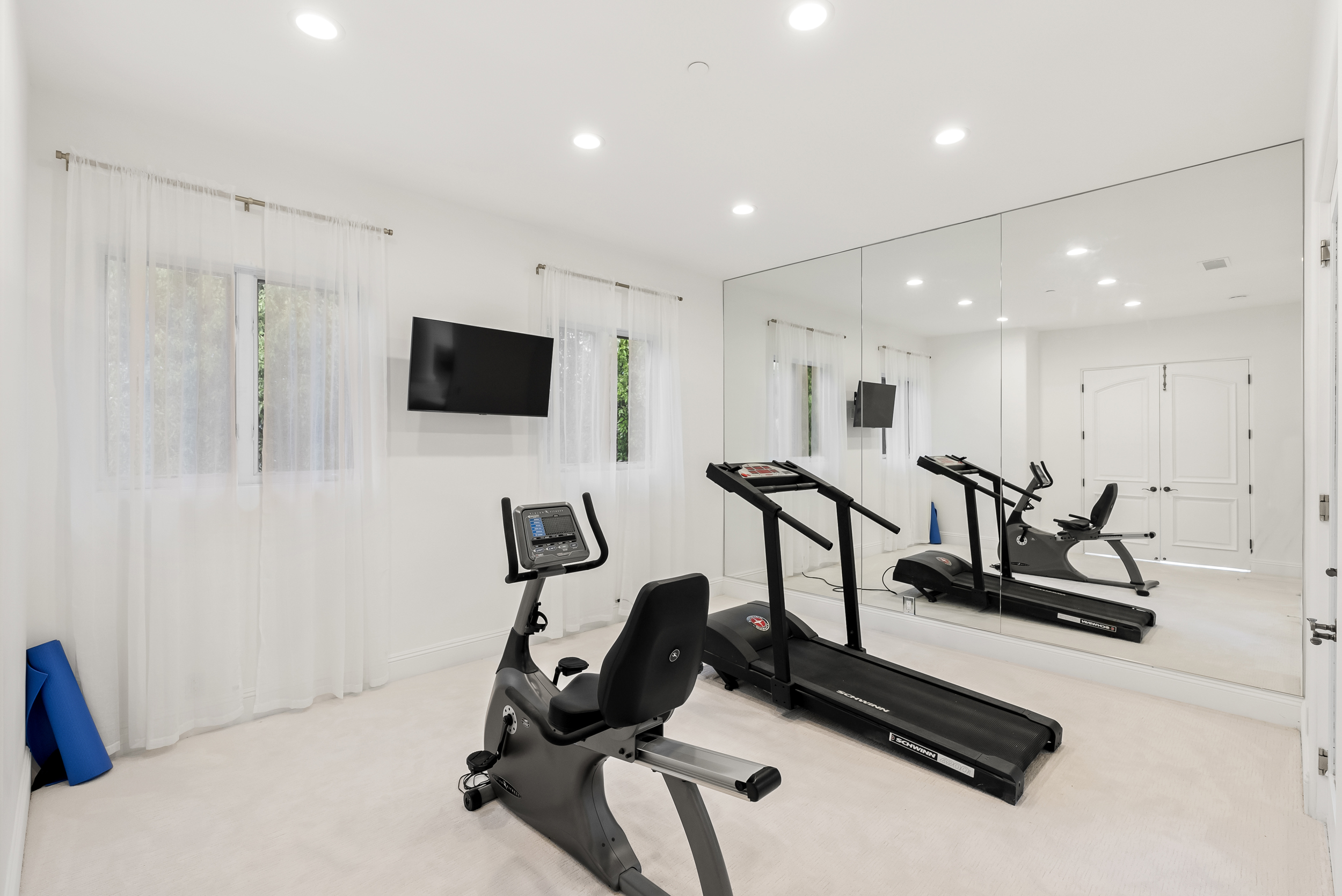 A newly added 10-seat home theater with heated, massaging chairs offers a true cinematic escape, while a dedicated home gym brings fitness and wellness into daily life. Upstairs, dual primary suites offer spa-like bathrooms with steam showers, a sauna, and custom-designed closets—ideal for multi-generational living or luxurious guest quarters. New carpeting, fresh paint, LED lighting, and upgraded HVAC systems ensure comfort and efficiency throughout.