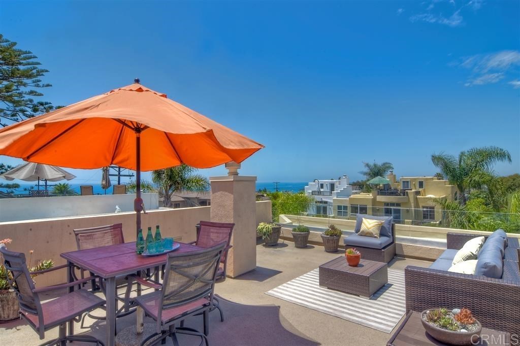 Sold! Dine on your own private 360-degree ocean view roof deck and enjoy beach living west of 101 in Leucadia, just a short walk to Grandview and Beacons Beaches, dining, and entertainment. This reverse floor plan features Jack & Jill bedrooms downstairs, an upstairs dining and living area, master bedroom, and three decks—two with ocean views—plus a staircase leading to the rooftop deck. A gated courtyard entrance, private patio yard with hot tub, and upgrades like wood-look tile floors, a n...