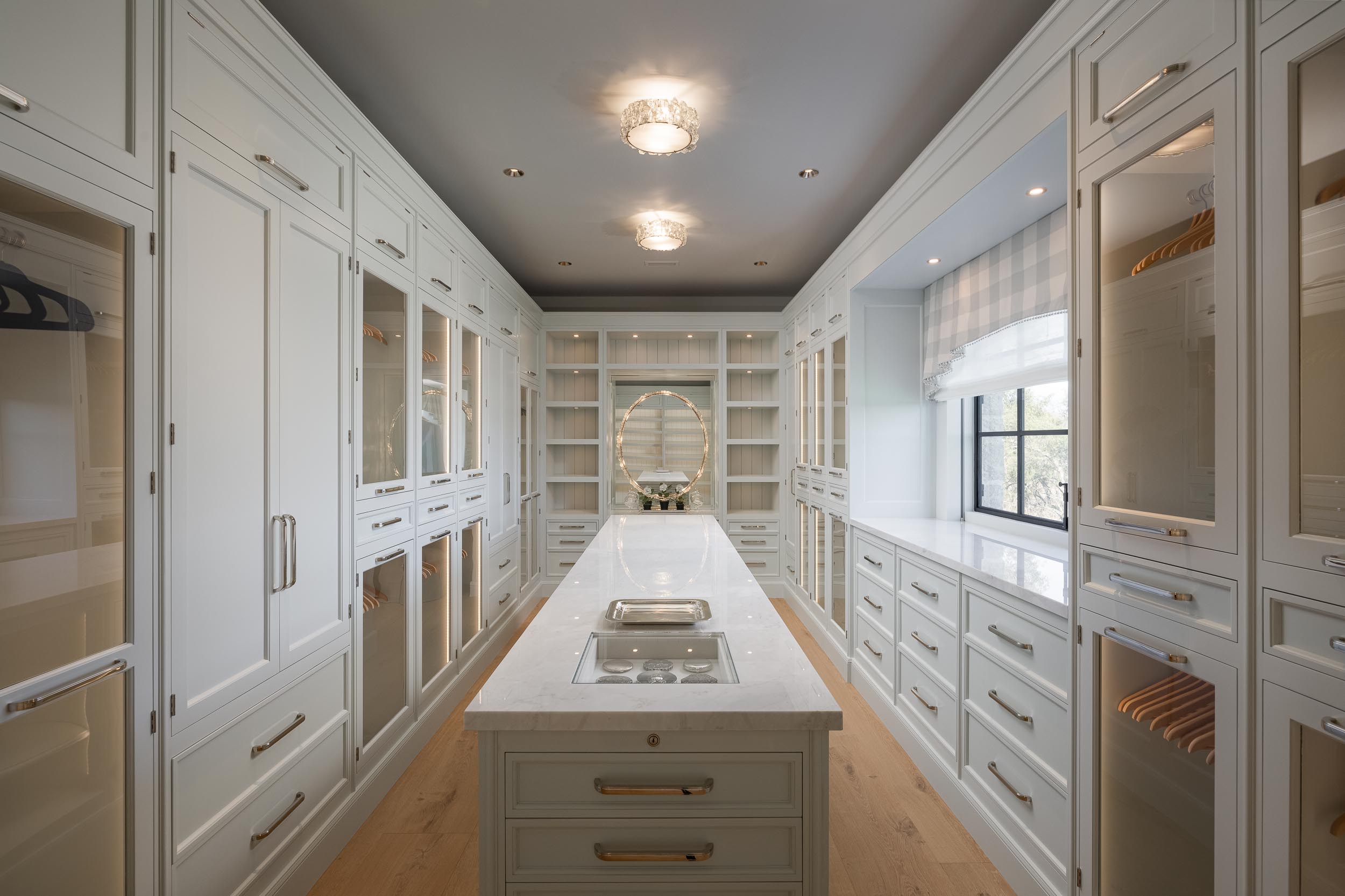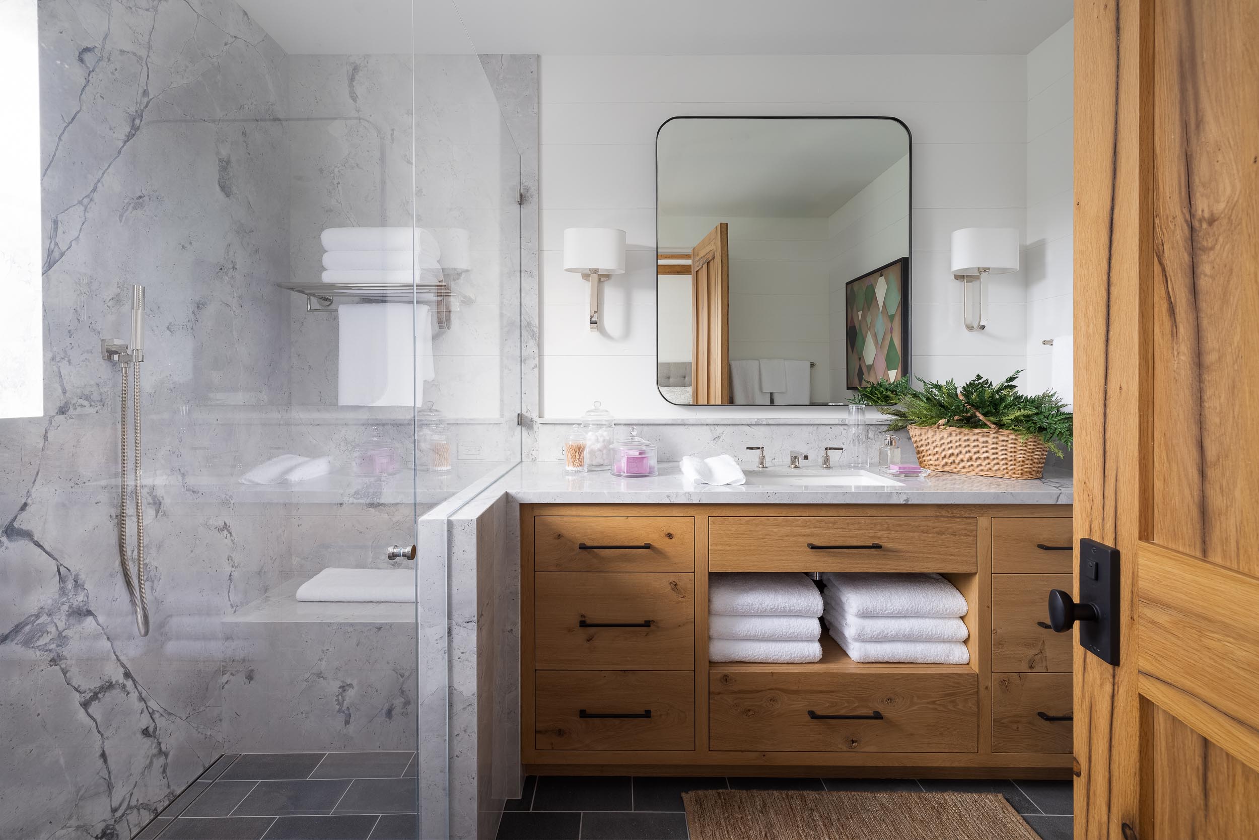 The primary suite is a serene escape, offering a spa-inspired bath wrapped in Michelangelo marble, a deep soaking tub, and sweeping views of the lush gardens beyond. The outdoor spaces are a dream come true, where the estate’s natural beauty comes to life. A French village water basin turned fountain and the zero-edge pool and spa with the picturesque backdrop of the majestic Black Mountains create an unparalleled sense of tranquility.