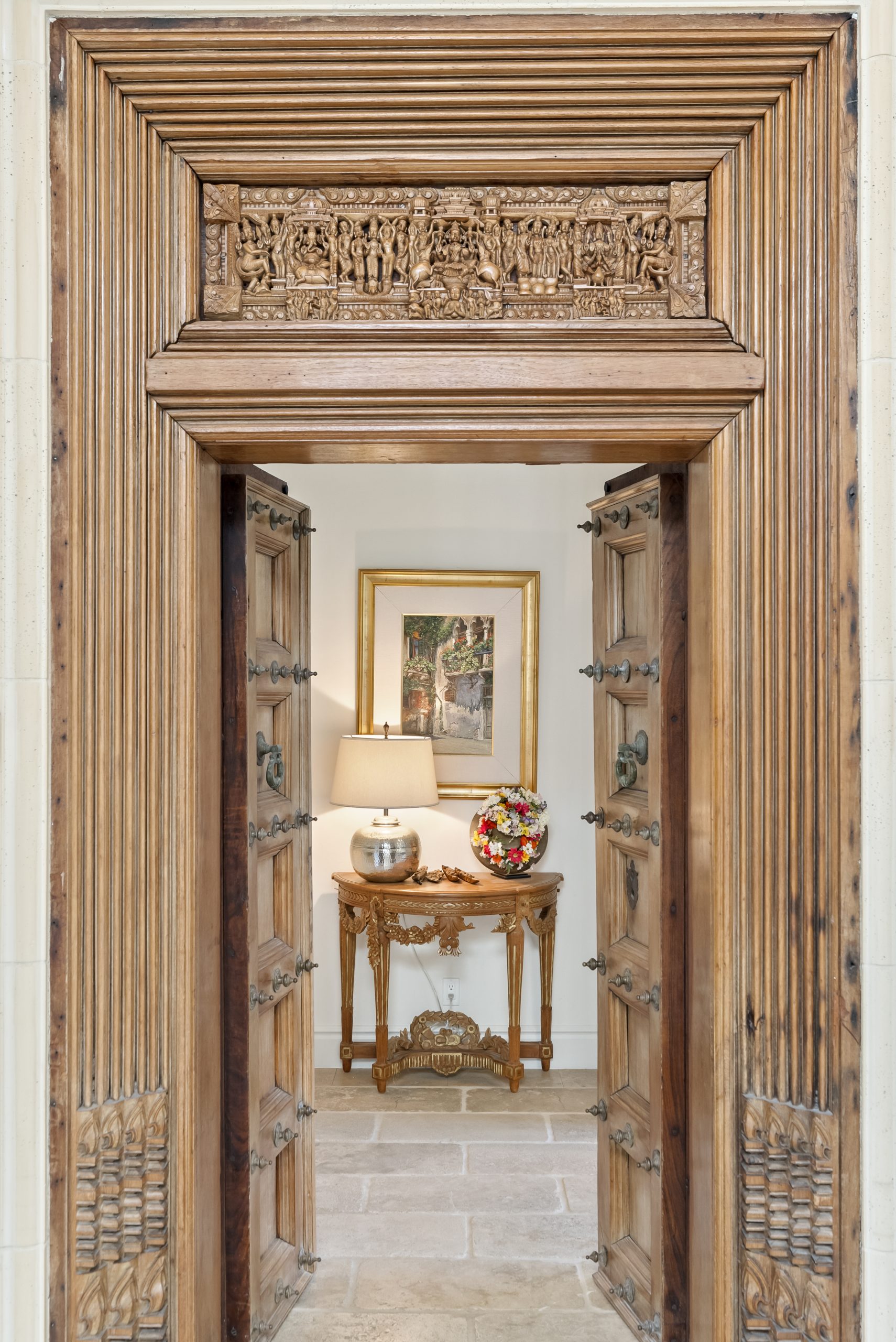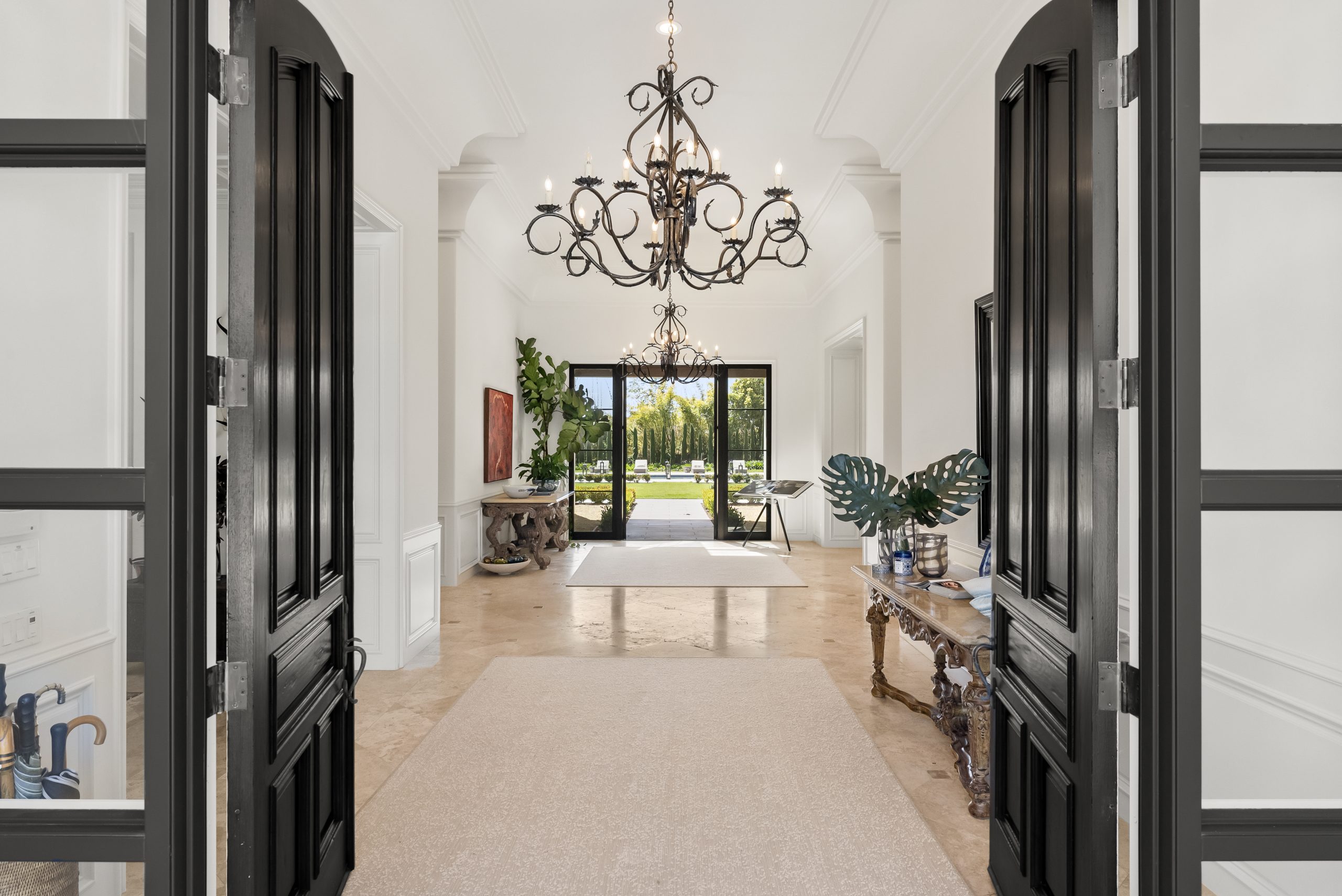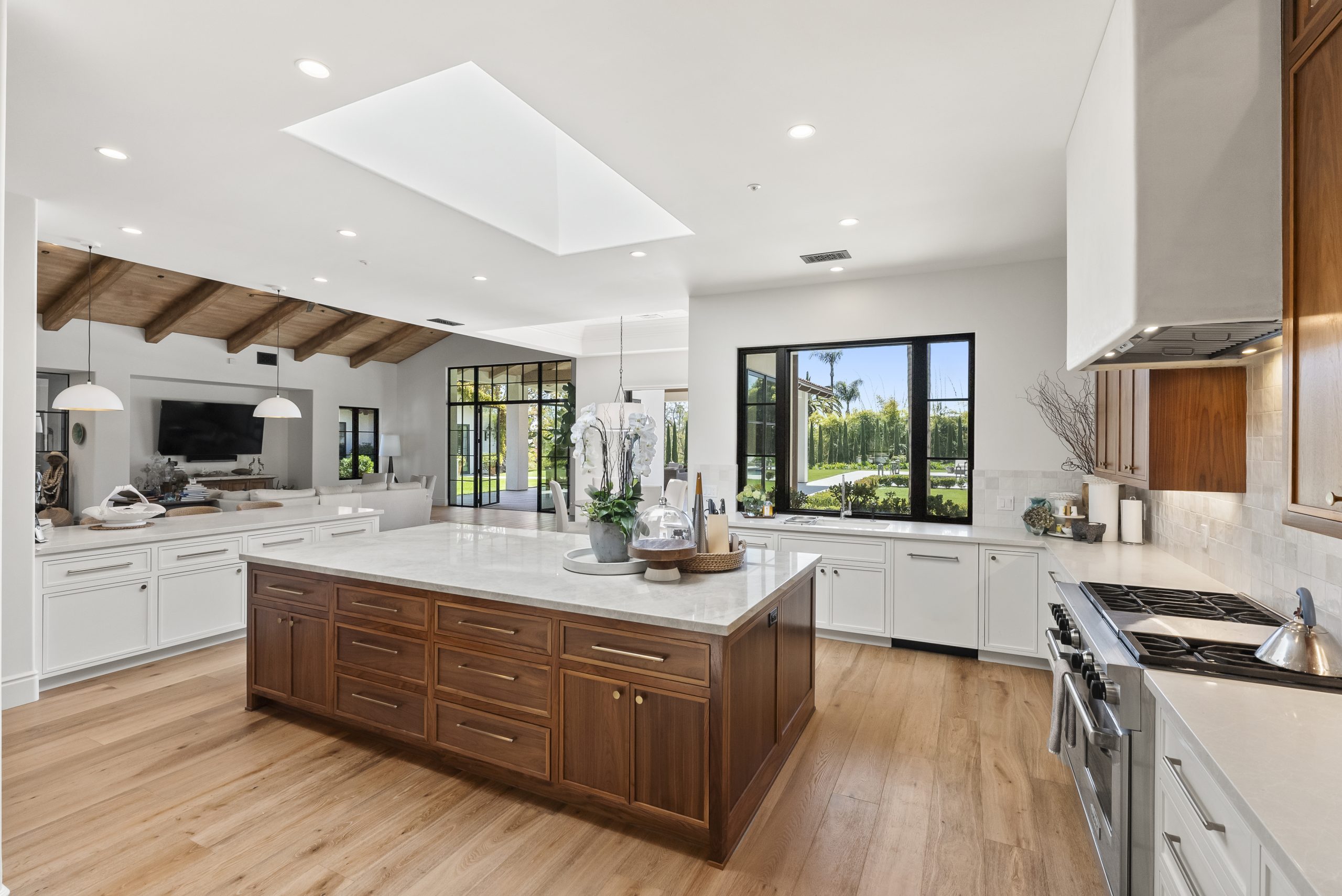 Beyond its private gates, this modern Mediterranean estate immediately commands attention with its enduring presence and architectural sophistication. A sweeping circular drive winds through lush, manicured landscaping, flanked by mature palms that frame the home’s elegant new white Santa Barbara Finish stucco exterior and red clay tile roof—hallmarks of the sought-after California Mediterranean style. The grand entry showcases arched double doors and intricate wood detailing, opening to light-filled interiors with soaring ceilings, graceful proportions, and polished finishes that echo the architectural vision. The open-concept floor plan unfolds effortlessly, designed to elevate everyday living and accommodate sophisticated entertaining.