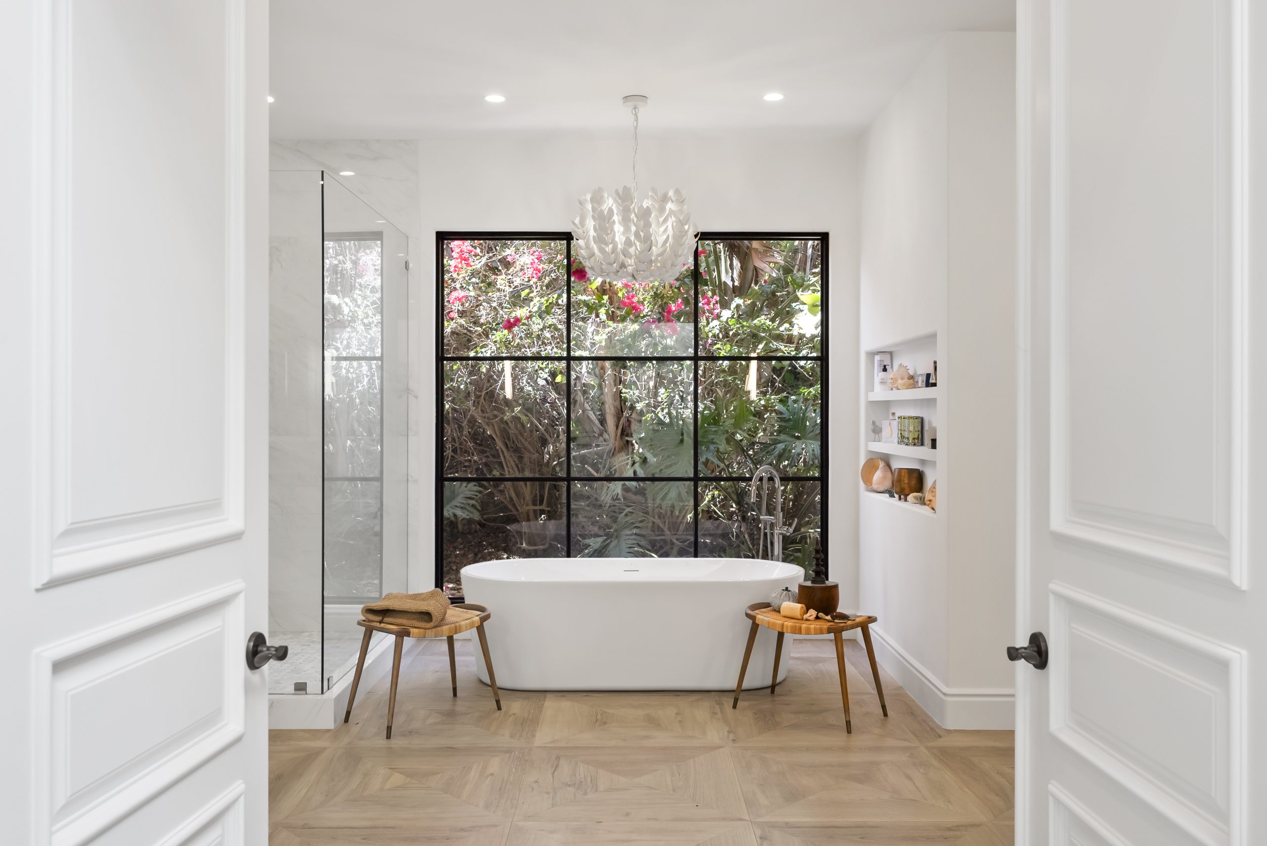 The main residence features generous en-suite guest bedrooms, dual offices, and a luxurious primary suite that serves as a private sanctuary. Anchored by a stately fireplace and expansive windows, the suite offers a refuge for relaxation and rejuvenation. The spa-like bath features a freestanding soaking tub set against a wall of glass framing lush greenery, a generous walk-in shower, and dual walk-in closets. At the heart of the home is a stunning gourmet kitchen outfitted with top-tier Subzero, Wolf, and Miele appliances. Clean-lined cabinetry and rich countertops pair beautifully with an oversized kitchen window that frames the peaceful outdoor spaces and picturesque natural surroundings.