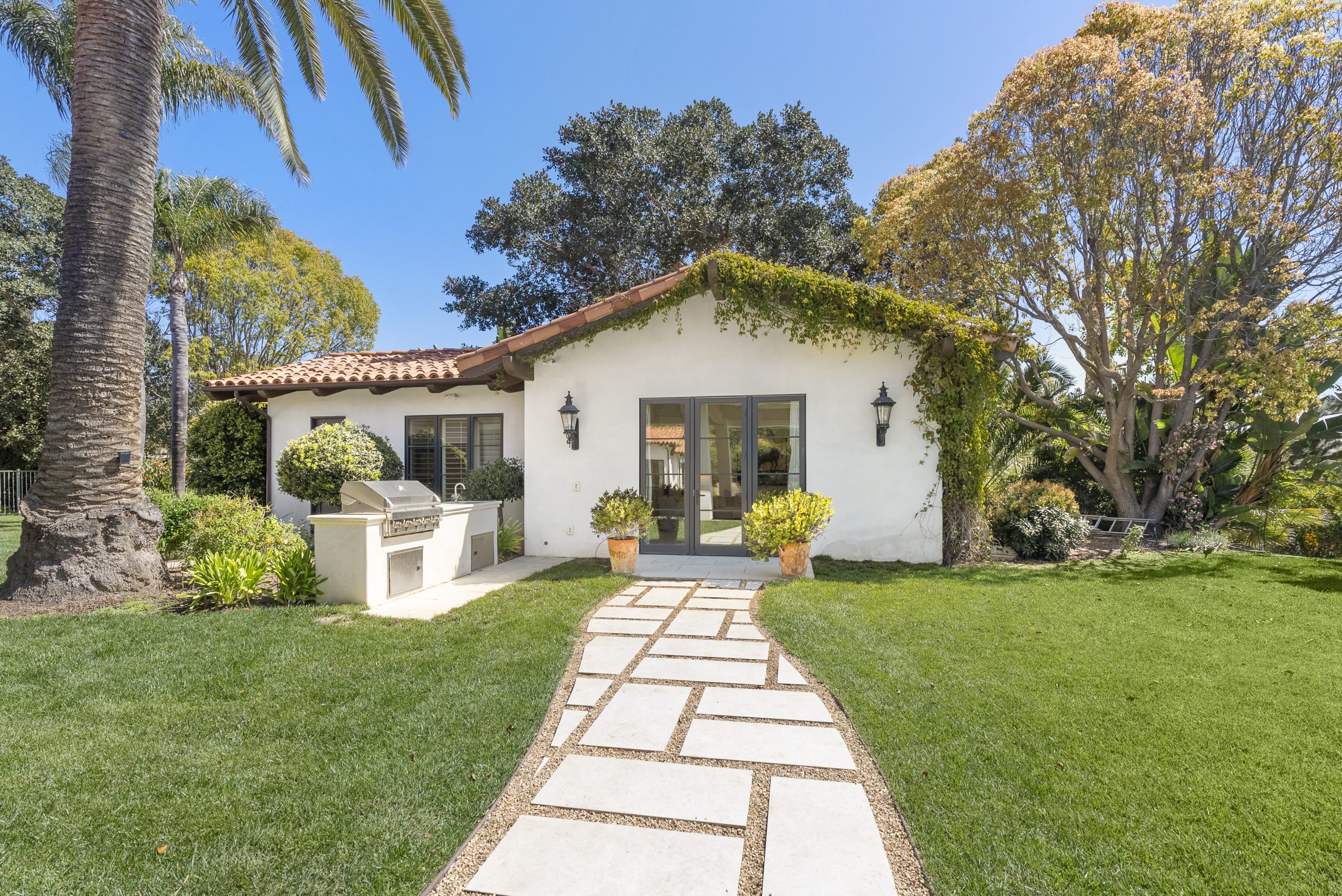 Outdoors, the estate continues to impress with a seamless extension of the home’s thoughtful design and inviting atmosphere. A prominent architectural feature is the grand loggia with cathedral ceilings and a striking fireplace that serves as the perfect setting for al fresco dining, lounging, or entertaining throughout the year. Just beyond, a detached guest house provides a private and comfortable haven for extended stays, designed with the same attention to detail as the main residence. The expansive backyard evokes a sense of retreat, complete with a sparkling pool, generous sun deck, covered putting green, full-size oyster shell bocce court, and raised garden beds—ideal for both relaxation and recreation. Whether gathering under the stars or enjoying the quietude of the day, the outdoor space offers a truly memorable experience.