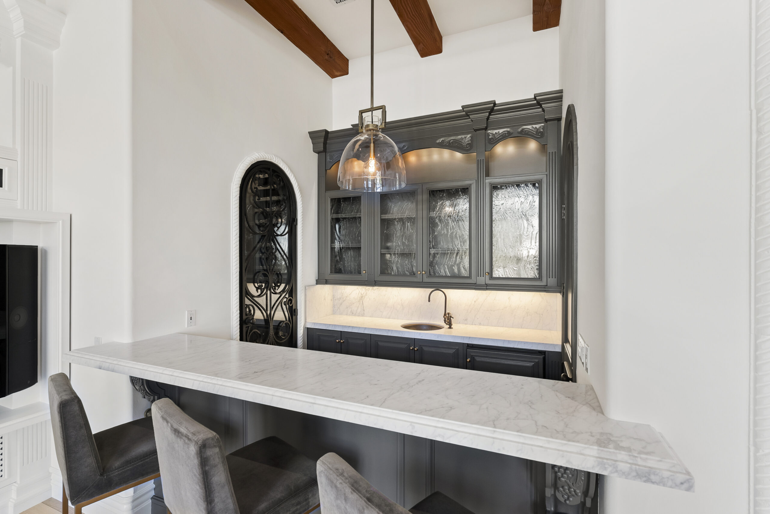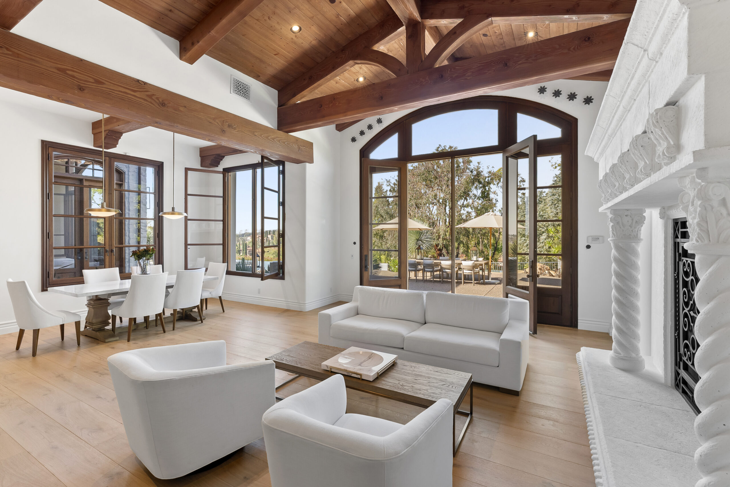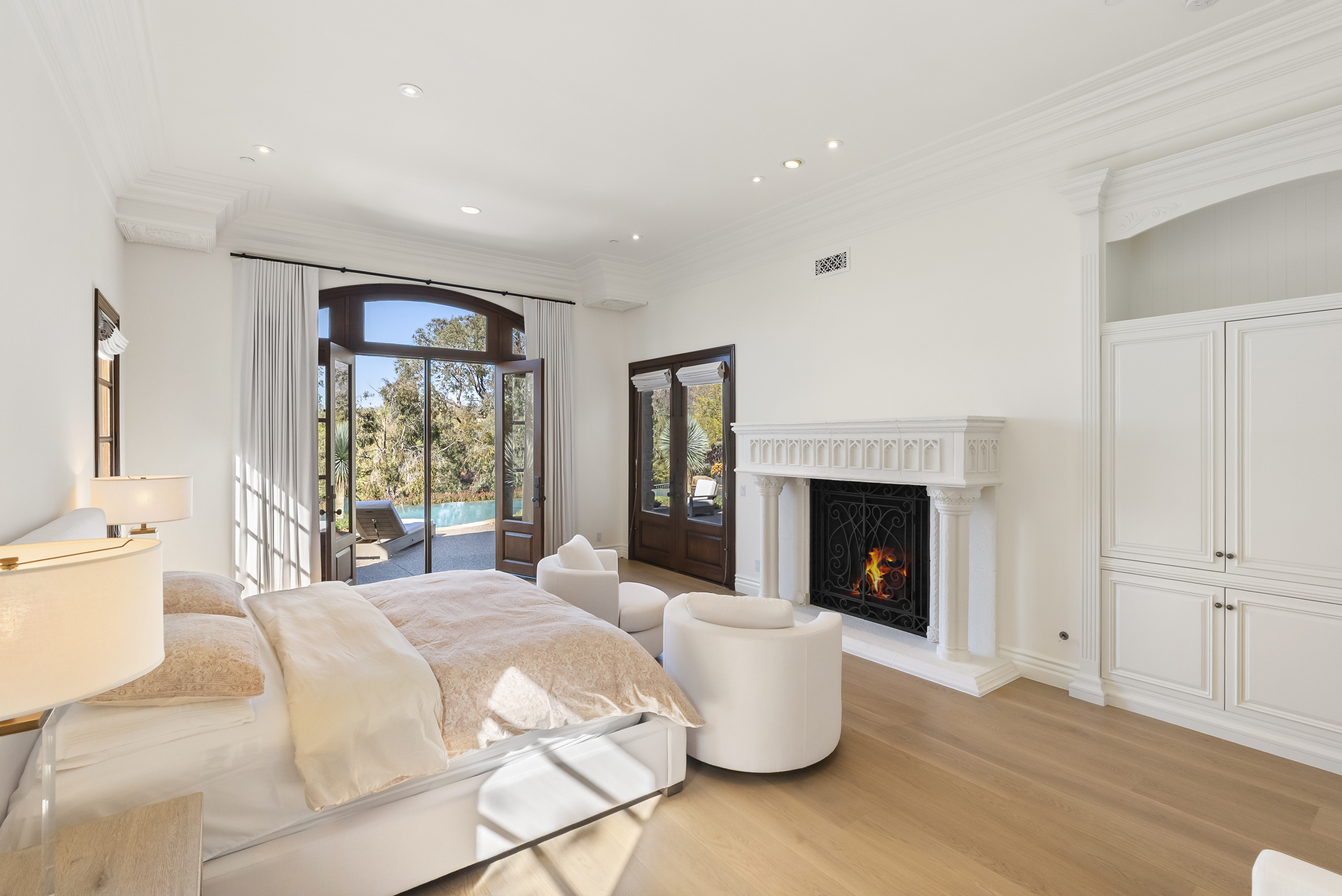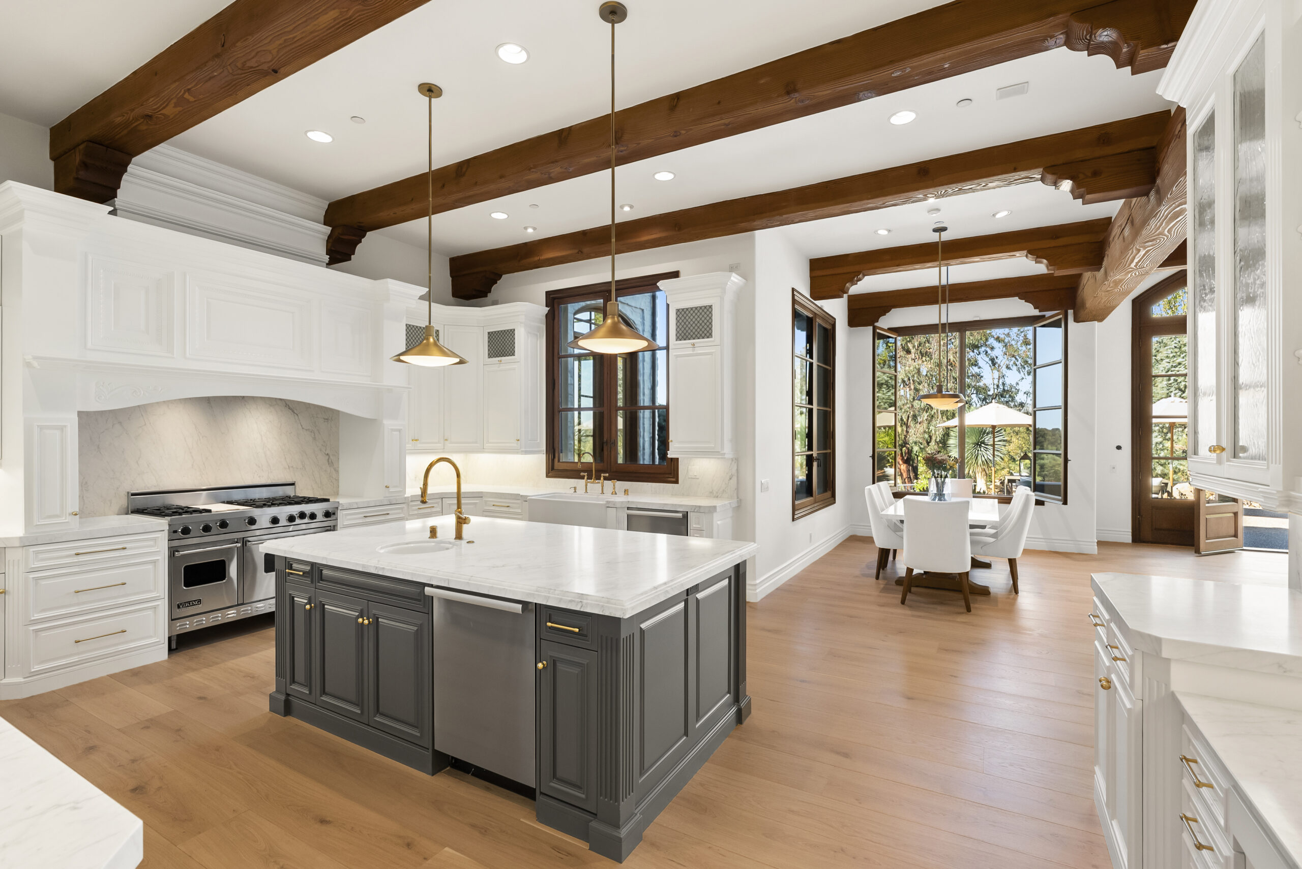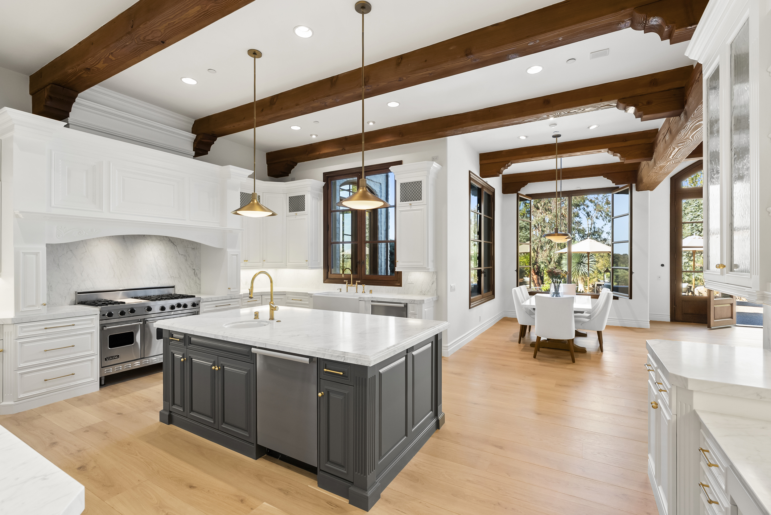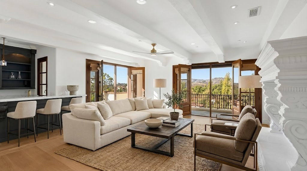 Inside, natural light pours through expansive windows and French doors that open to the golf course, creating a perfect indoor/outdoor connection ideal for both daily living and entertaining. Every finish was chosen with care—from hand-finished limewashed fireplaces and European white-oak floors to Italian marble countertops, burnished-brass fixtures, and designer lighting. The reimagined kitchen serves as the heart of the home with a farmhouse-style sink, premium appliances, oversized walk-in pantry, bar, and temperature-controlled wine cellar that make entertaining effortless. Additional spaces include a built-out home theater, elegant office, and a separate guest wing with private access that offers versatility for guests, multigenerational living, or creative use.