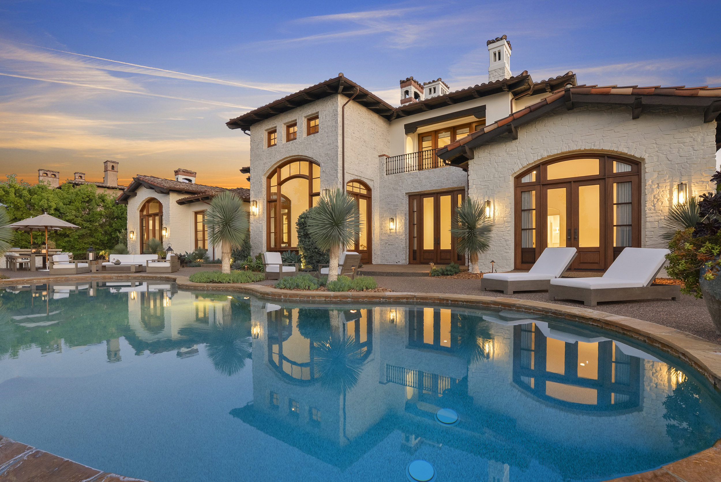 The primary suite is a true retreat, featuring a newly remodeled bathroom in Italian marble with dual vanities, a freestanding soaking tub, and spa-like tranquility. Outside, the lush grounds create a resort-like backdrop for year-round living with a saltwater pool and spa, built-in BBQ bar, and sweeping fairway views framed by golden evening light over the clubhouse.