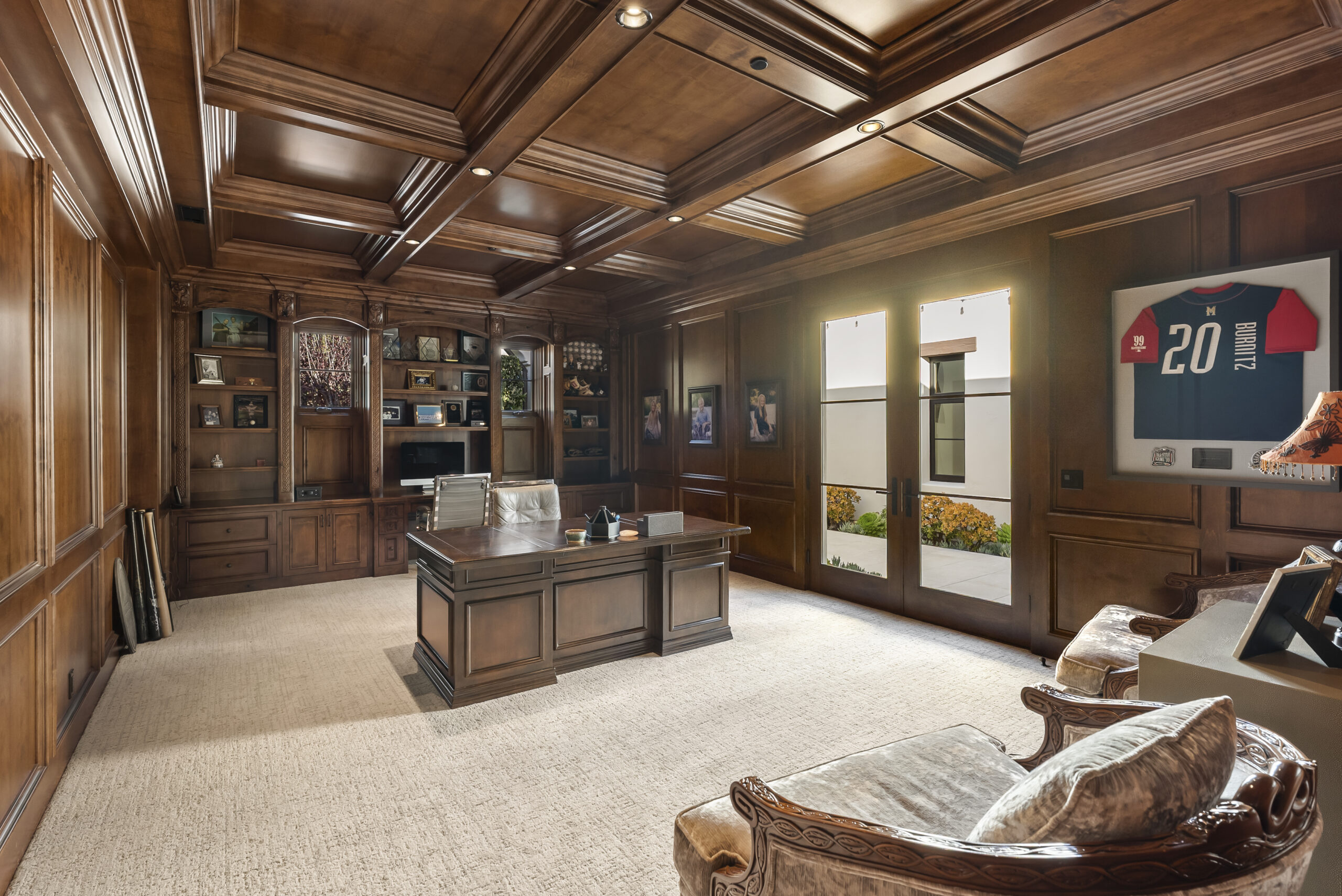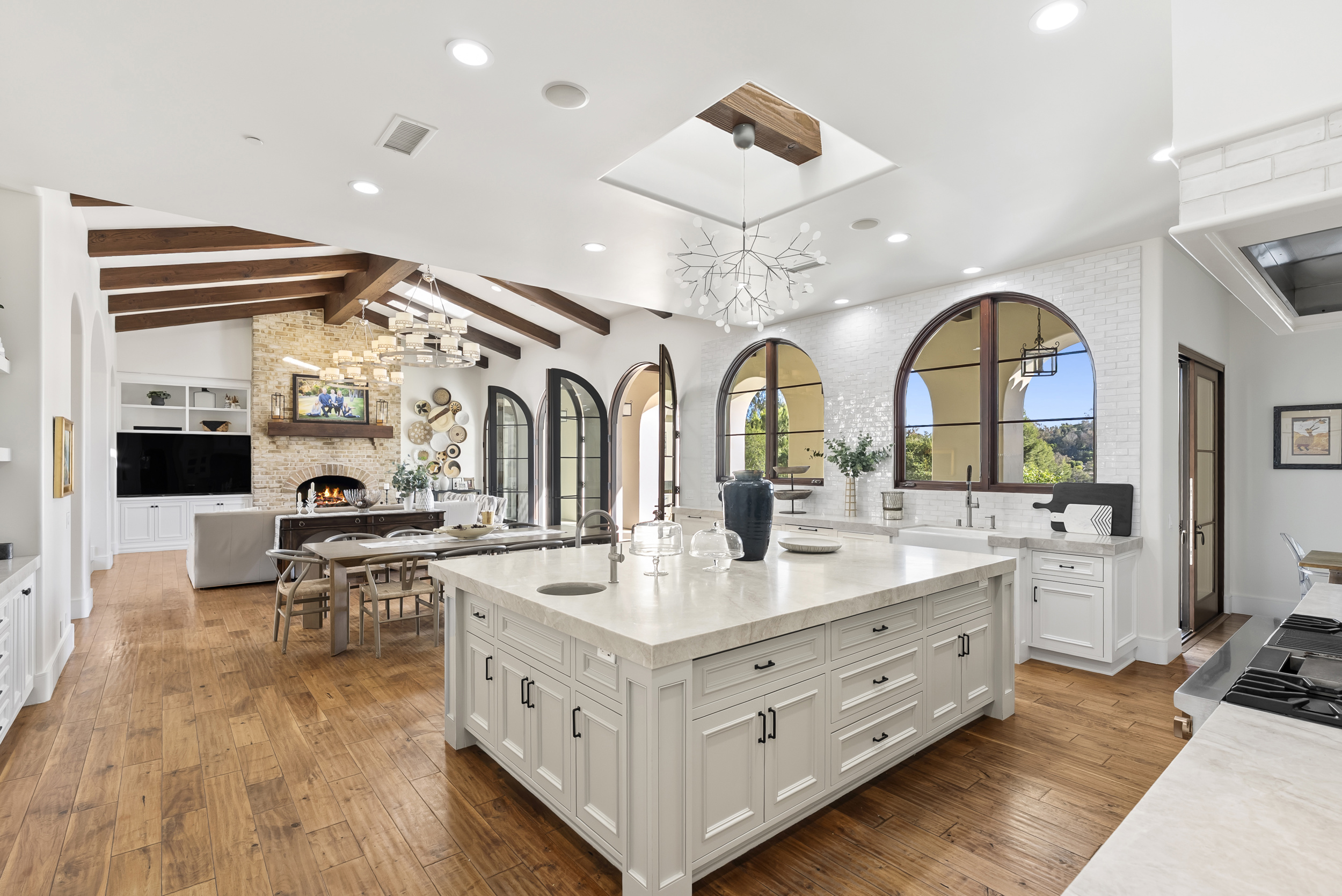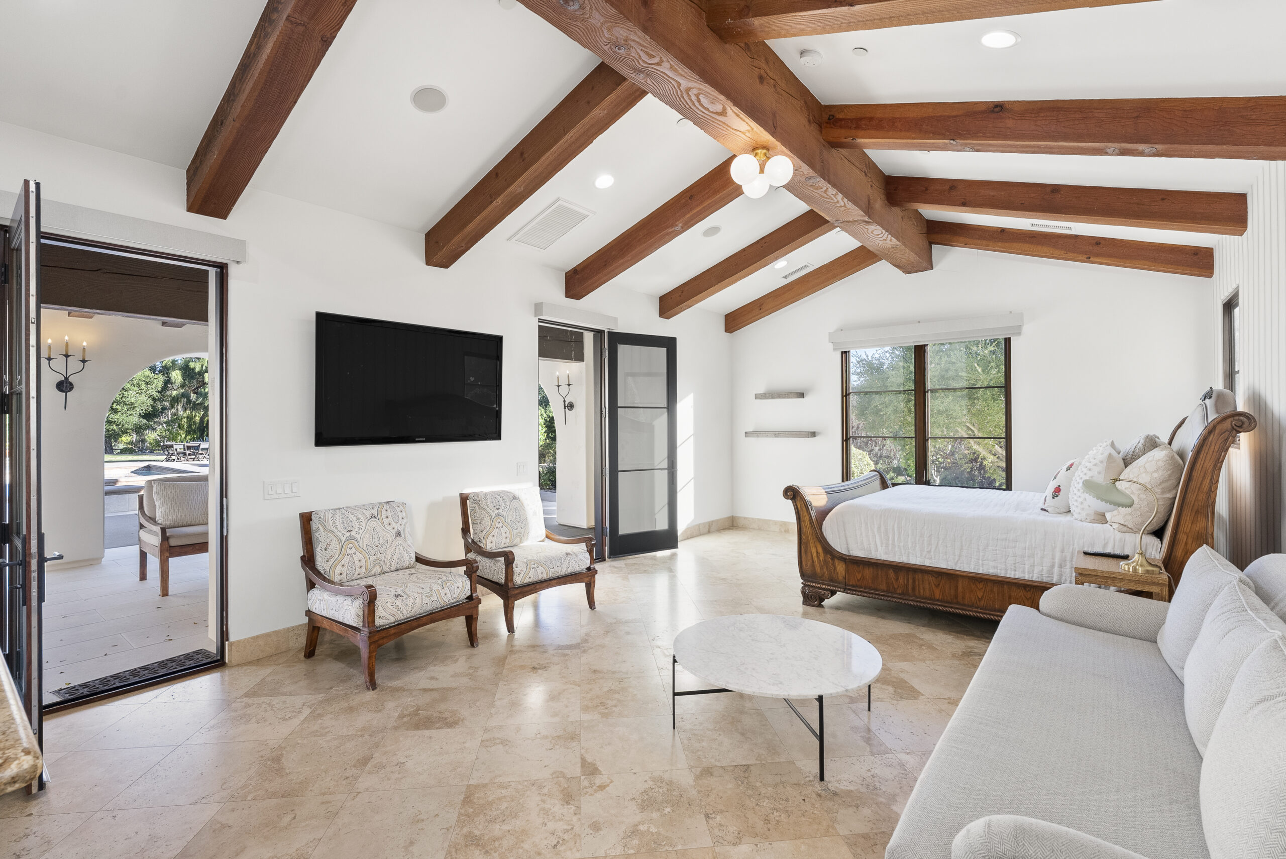 The main residence spans approximately 9,096 square feet and features 5 en-suite bedrooms plus a dedicated office — with four bedrooms positioned on one wing and a private fifth on the other, offering natural flexibility for family and guests. At the center of it all, a remodeled kitchen anchors the main living spaces, opening seamlessly into the great room and out to the backyard. Light moves easily through the home, the views are ever-present, and the indoor-outdoor connection feels effortless at every turn. The primary suite is tucked away from the main living areas, offering a genuine sense of retreat — complete with a soaking tub, oversized walk-in closet, and a comfortable sitting area.