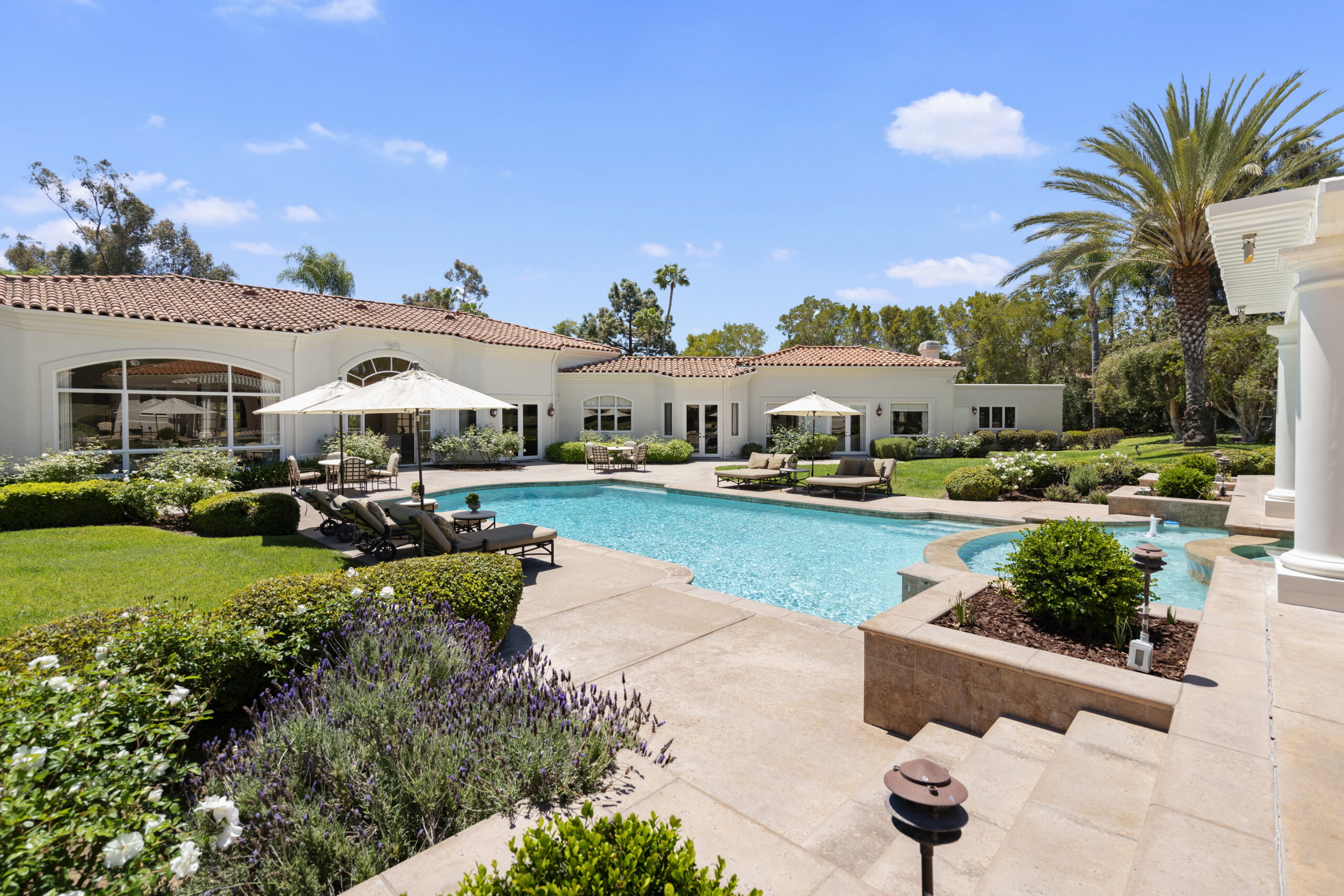 SOLD! This exceptional single-level estate in Rancho Santa Fe Covenant offers over 7,000 square feet of refined living on more than two resort-like acres. Recently renovated with premium finishes, the home boasts a gourmet kitchen, sunlit breakfast nook, spacious family room with an entertainer’s bar, executive wood-paneled office, and a lavish primary suite with dual baths and a sauna. The stunning grounds feature a detached guest house with a full kitchen and surround sound, a sparkling pool...