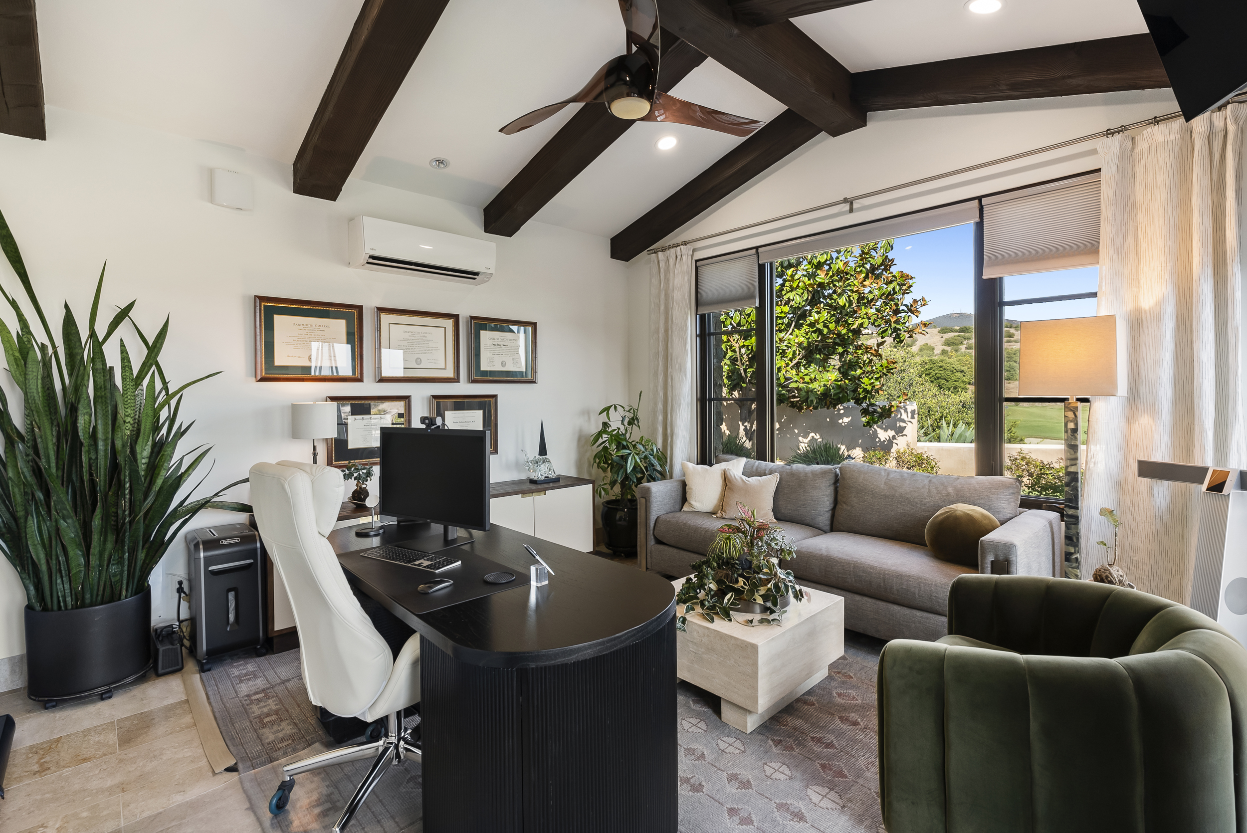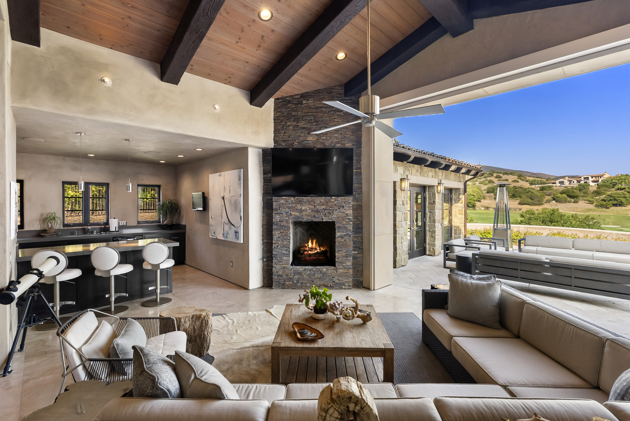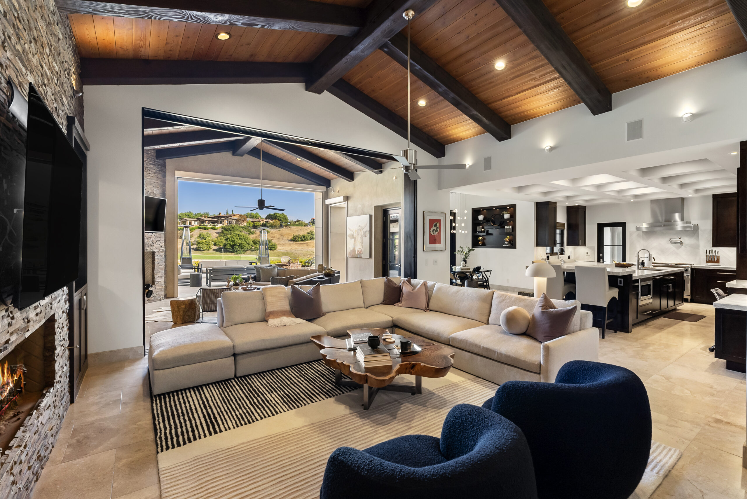 Expansive patios open to a private backyard oasis with a saltwater pool and spa, outdoor fireplace, barbecue kitchen, and fruit tree grove, all framed by lush landscaping and golf course views. Thoughtful upgrades such as a fully owned 23kW solar array and whole-home reverse osmosis system reflect a commitment to both luxury and sustainability.