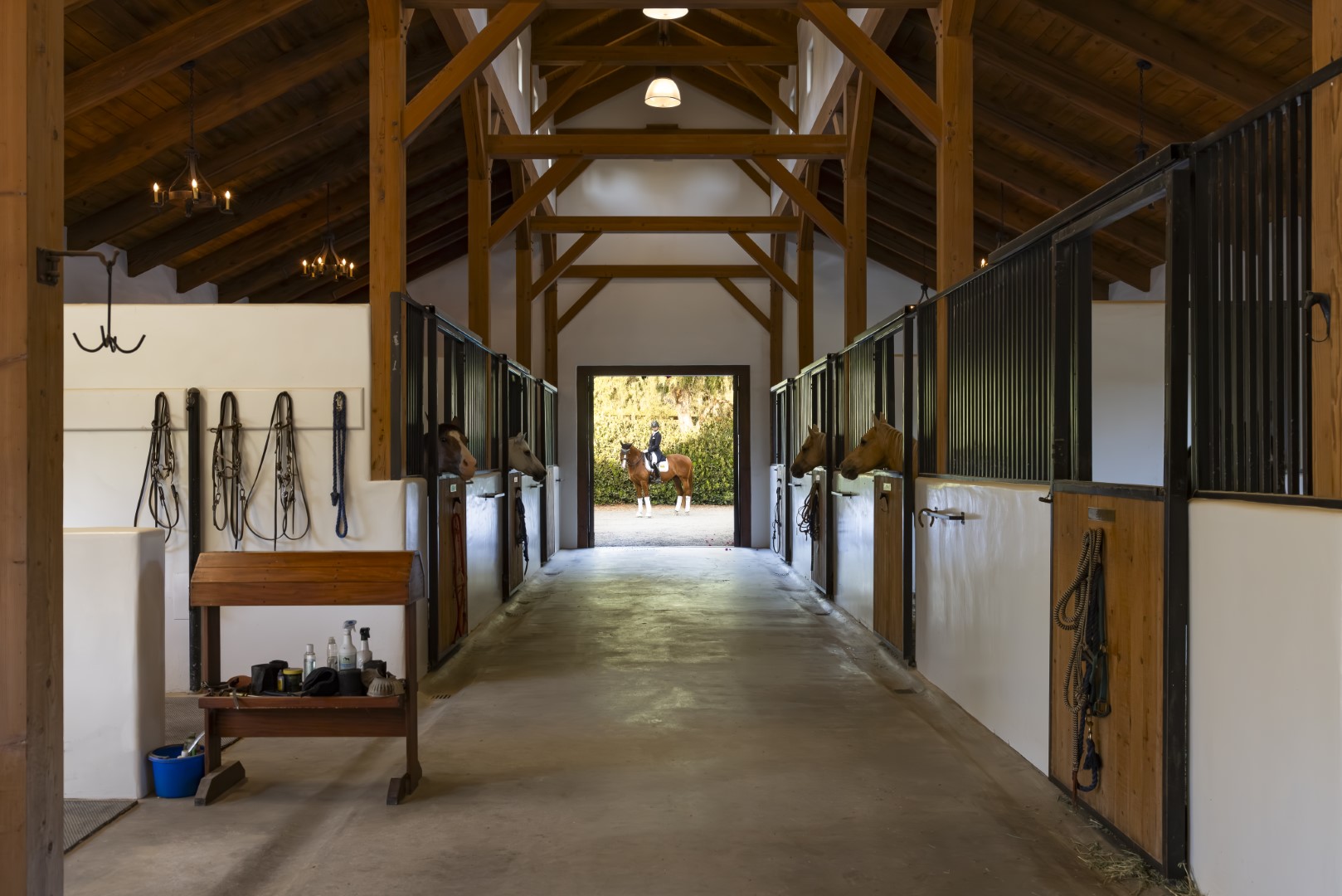The estate also serves as a haven for outdoor enthusiasts and equestrians alike. Spanning across 77 acres, it features private trails ideal for hiking, running, and horseback riding, as well as a pristine 15-acre bass-filled lake perfect for paddleboarding, canoeing, and fishing. Equestrian facilities include two state-of-the-art barns, 35 stalls in total, a professional riding arena where Olympic hopefuls have trained, and lush pastures, making it ideal for a variety of equestrian disciplines. Every detail of the land has been crafted to provide an exceptional experience, from the tree-lined trails to the numerous paddocks, ensuring a life of exploration and adventure.